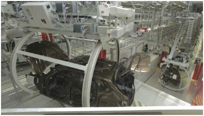 走在明亮、潔凈的廠房里,你除了會不斷顛覆對“工廠”和“車間”的傳統(tǒng)理解,還很難忽略那些同時“飛在頭上”和“走在身邊”的車身。整個車間分為兩層,合理利用了空中和地面物流的空間優(yōu)勢,可以讓零部件和預裝模塊盡可能通過最短的路線輸送到生產(chǎn)線上。